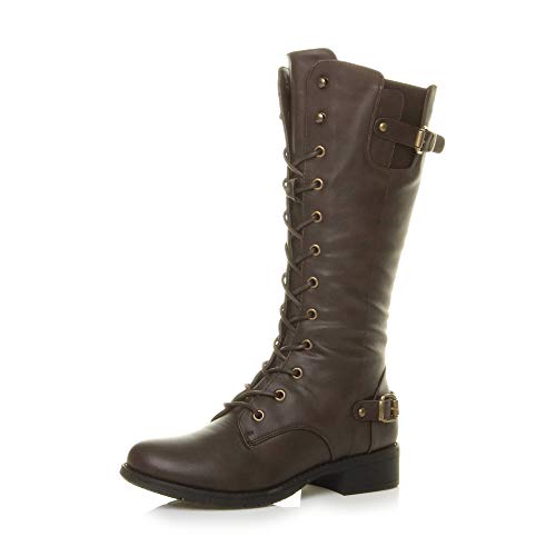Womens Ladies Low Heel lace up Zip Biker Military Calf Boots, Brown Matte, 4 UK
